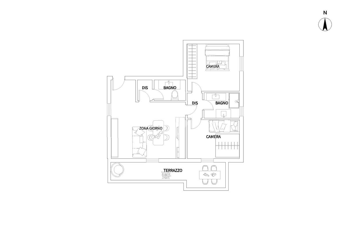 L’appartamento si sviluppa al primo piano ed è composto da soggiorno con cucina a vista, da questi due ambienti possiamo godere del terrazzo, seguono poi due camere da letto e due servizi di cui uno finestrato.