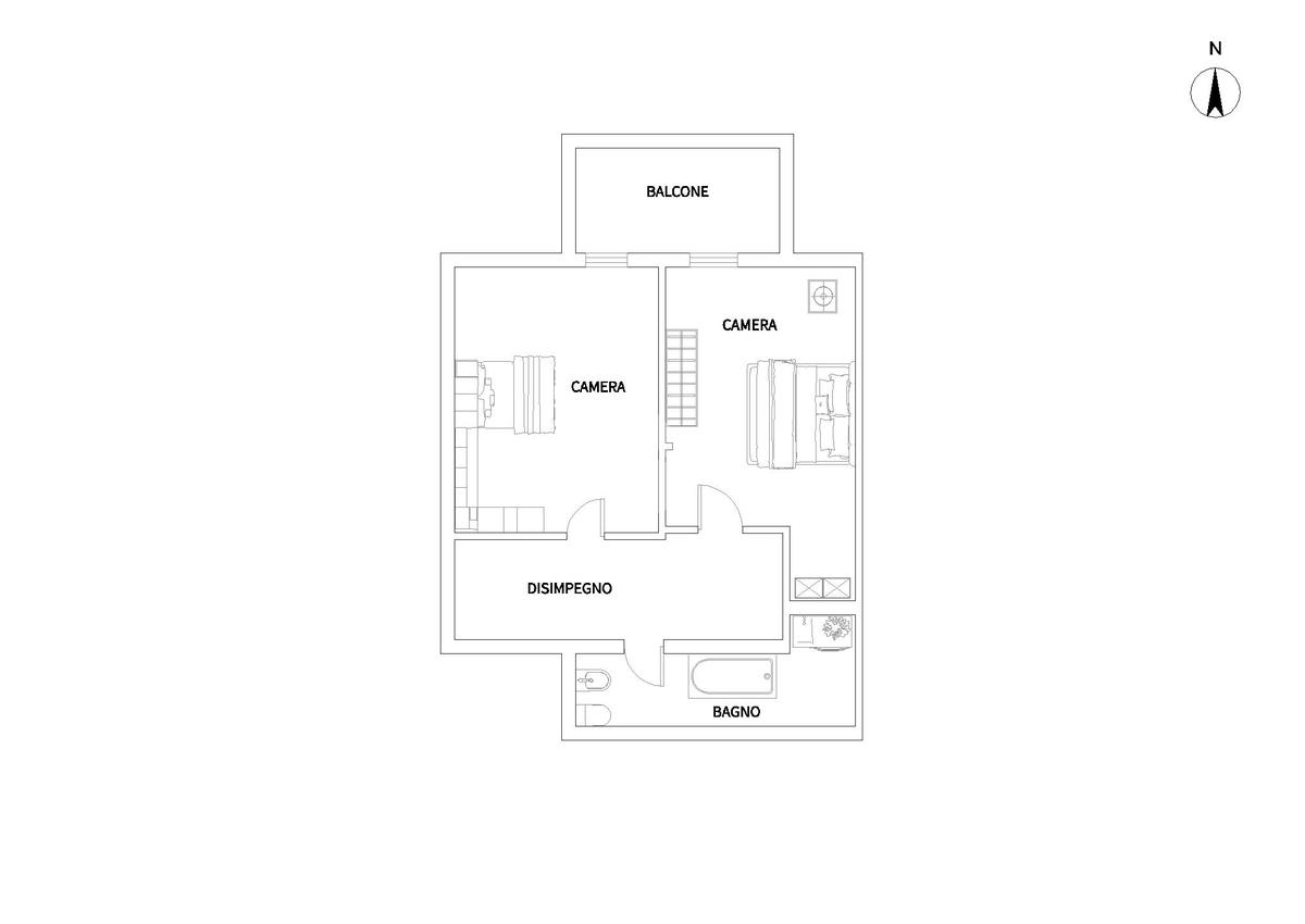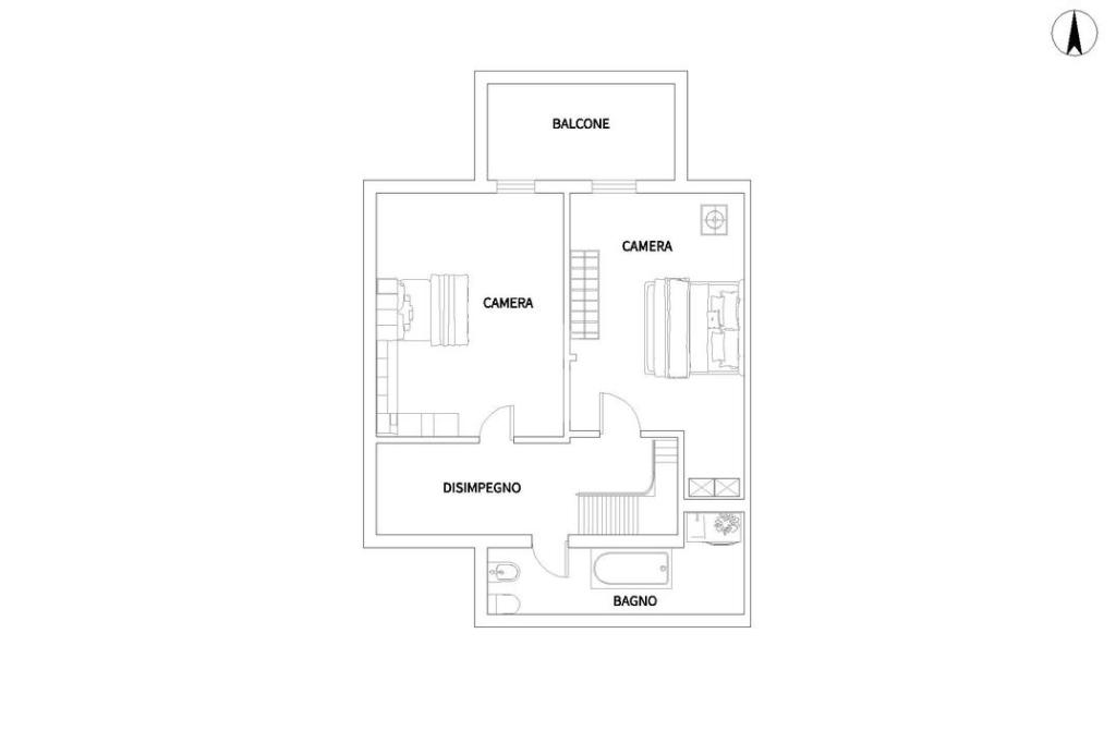 Tramite la scala passiamo al piano superiore dove abbiamo due camere da letto fornite di balcone ed infine il bagno, anch’esso finestrato.