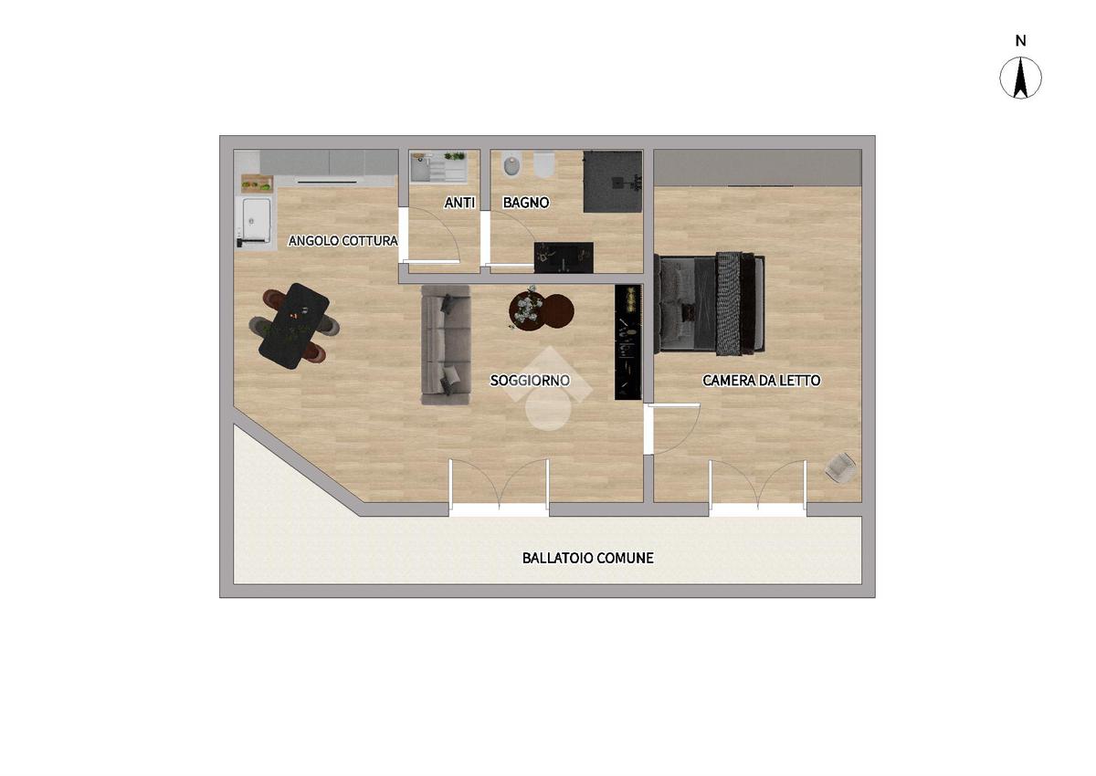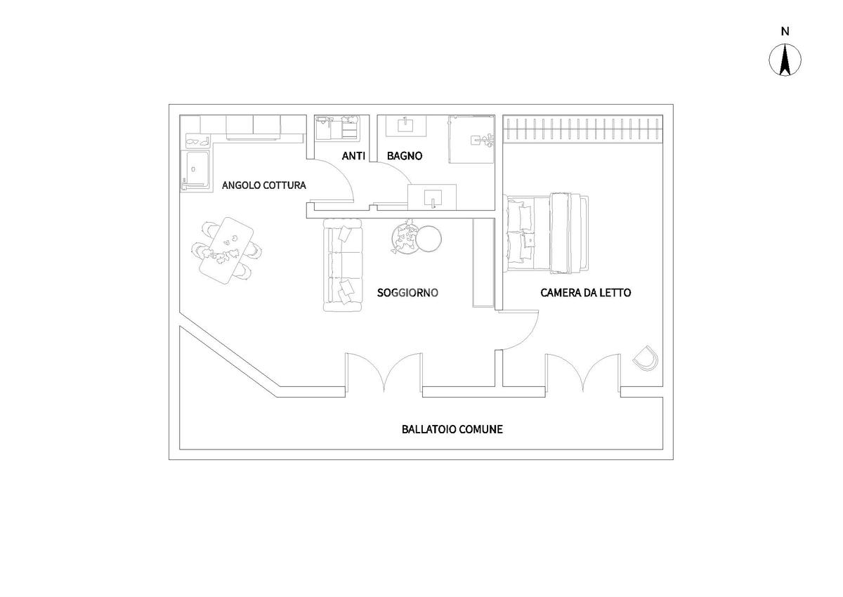 Entrando nell’appartamento veniamo accolti da un luminoso soggiorno fornito da cucina a vista, poi segue la camera da letto ed il bagno finestrato.