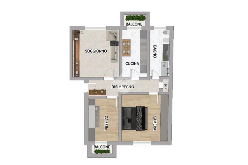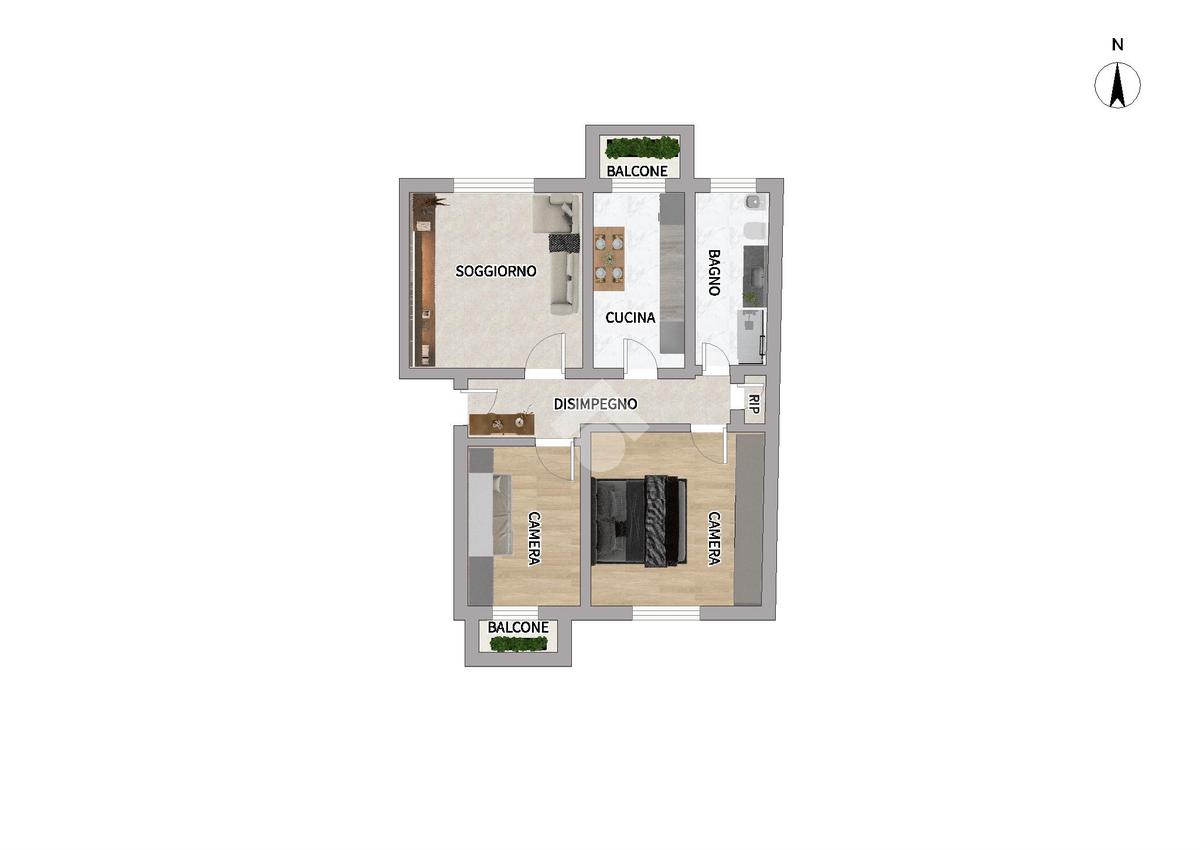 La disposizione interna è composta dal disimpegno che ci conduce al soggiorno ed alla cucina abitabile, poi passiamo alla camera matrimoniale, alla cameretta, al servizio finestrato con doccia ed infine al ripostiglio. L’abitazione è inoltre fornita da due balconi.