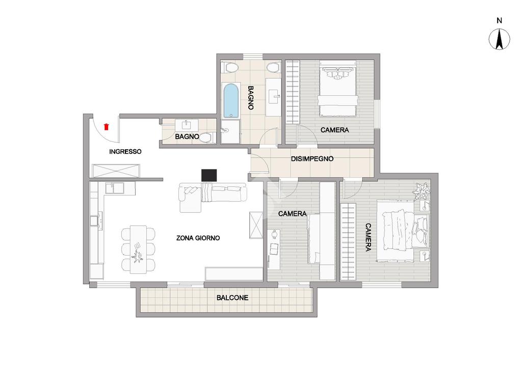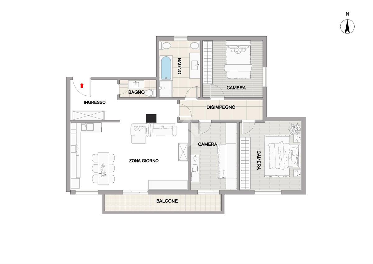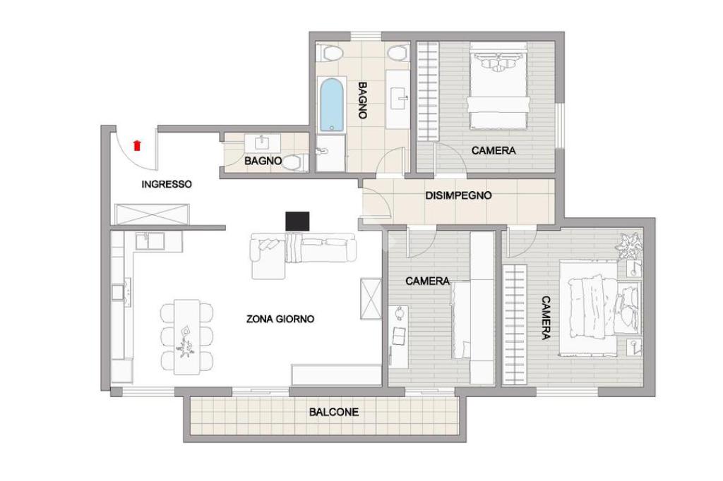 Entrando nell’abitazione abbiamo un ingresso che ci conduce nella zona living composta dal soggiorno e dalla cucina, da cui possiamo accedere al balcone. Tramite il disimpegno passiamo alla zona notte composta da tre camere da letto e da due servizi, di cui uno finestrato con vasca e doccia.