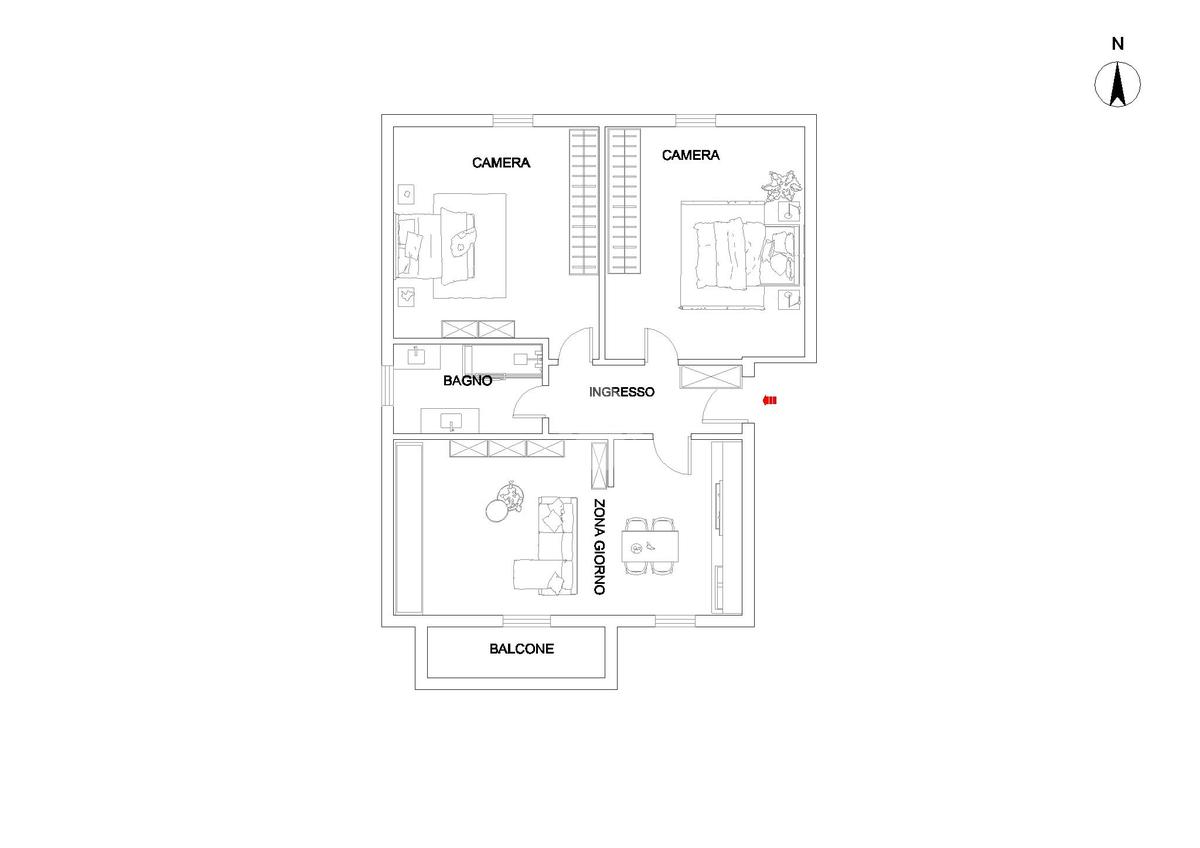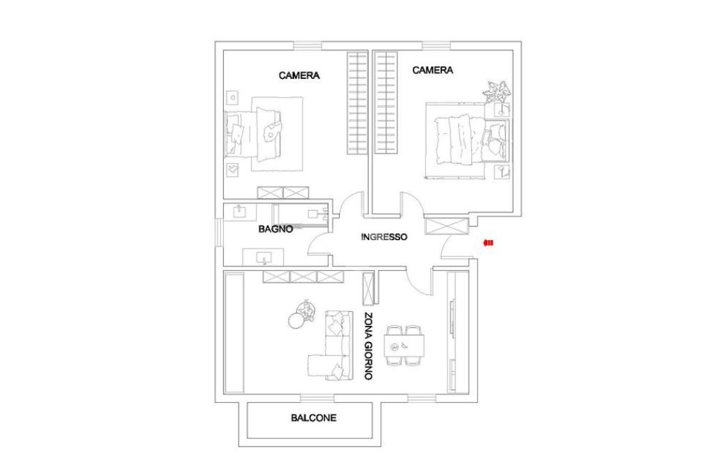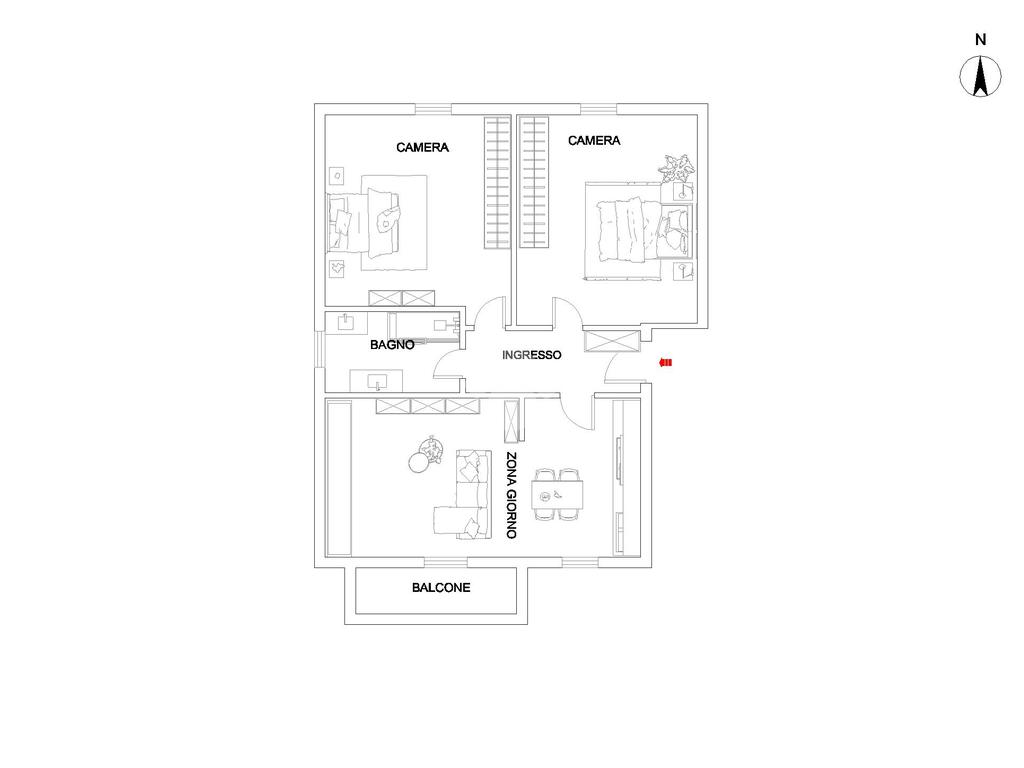 La disposizione interna è composta dalla zona living con cucina a vista e balcone, poi seguono due camere da letto matrimoniali ed il bagno finestrato con doccia.