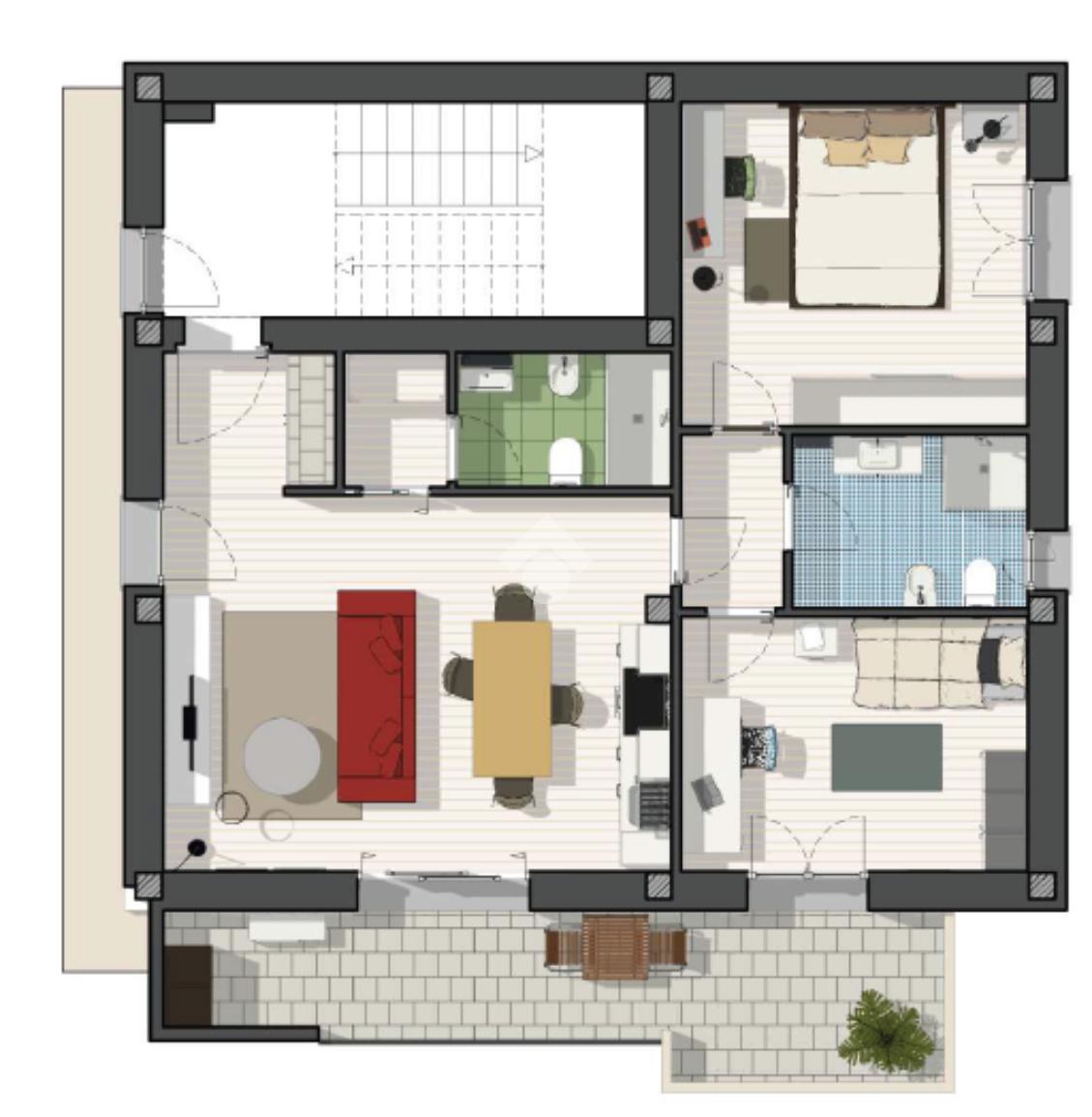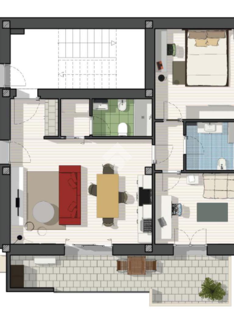 L’ingresso si apre sul soggiorno con la cucina a vista, con accesso diretto al terrazzo. La zona notte comprende due camere da letto e due servizi, di cui uno finestrato.