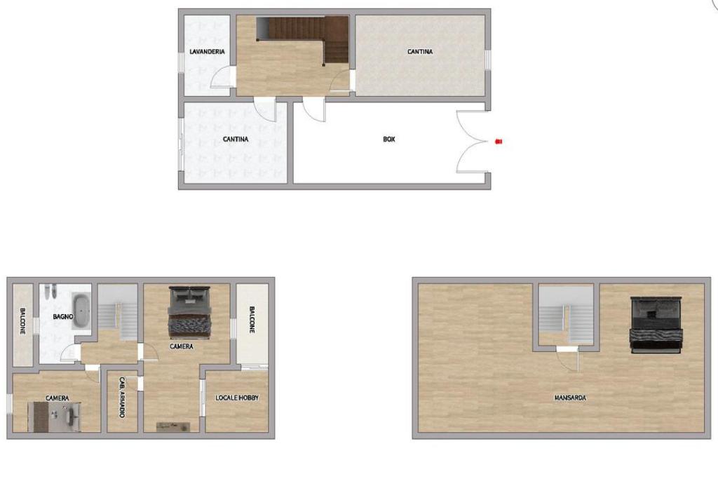 Salendo di un livello, tramite una comoda scala in muratura, passiamo alla zona notte composta da due camere da letto di cui una fornita di cabina armadio, balcone e locale hobby, poi segue il bagno con vasca e balcone.